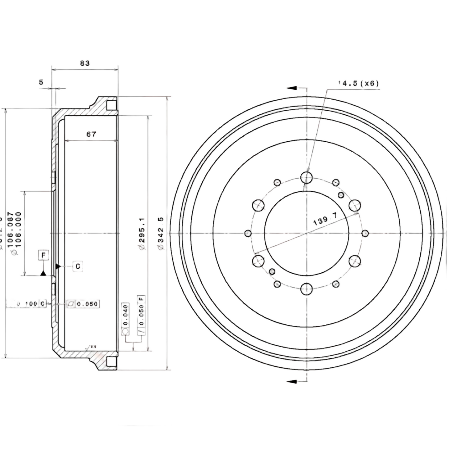 • 公称ドラム直径: 11.614 インチ (295.0 mm)